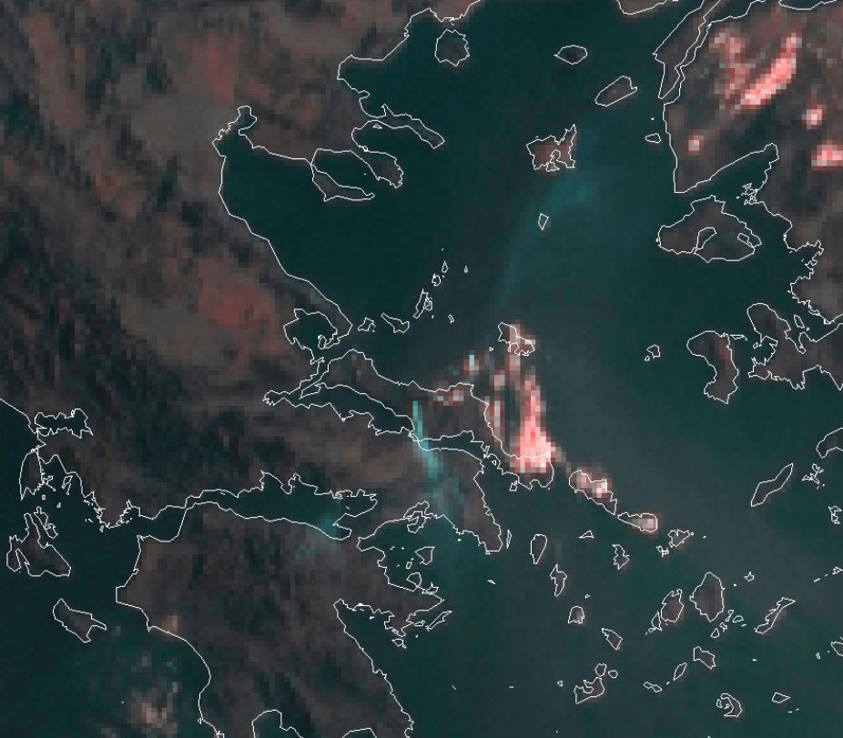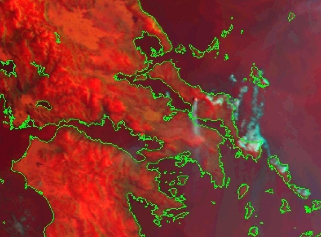 Οι δορυφορικές εικόνες από τη μεγάλη πυρκαγιά είναι αποκαλυπτικές. Ο καπνός, μεγάλο μέρος του οποίου έχει εγκλωβιστεί στο λεκανοπέδιο με αποτέλεσμα η ατμόσφαιρα να είναι αποπνικτική, φαίνεται με κυανό χρώμα.