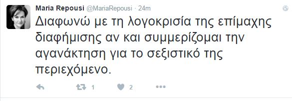 Παράλληλα, με δεύτερη ανάρτηση στο Twitter, η Μαρία Ρεπούση προσθέτει « αν θέλει η κυβέρνηση να παρέμβει θεσμικά να κυρώσει τη Σύμβαση της Κωνσταντινούπολης, για τη βία κατά των γυναικών αντί να λογοκρίνει σεξιστικές διαφημίσεις».