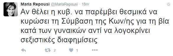 Παράλληλα, με δεύτερη ανάρτηση στο Twitter, η Μαρία Ρεπούση προσθέτει « αν θέλει η κυβέρνηση να παρέμβει θεσμικά να κυρώσει τη Σύμβαση της Κωνσταντινούπολης, για τη βία κατά των γυναικών αντί να λογοκρίνει σεξιστικές διαφημίσεις».
