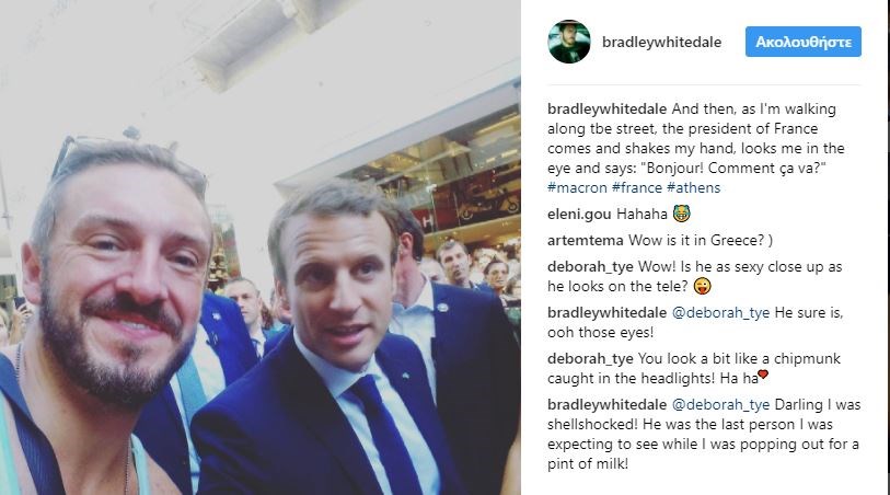 Συγκεκριμένα, ο κ. Μακρόν φωτογραφήθηκε με τον Μπράντλεϊ Γουάιτ-Ντέιλ, ο οποίος γνωρίστηκε στο show με τον Παναγιώτη Πάλλη δημιουργώντας τους Stereo Soul.Δείτε τη φωτογραφία: