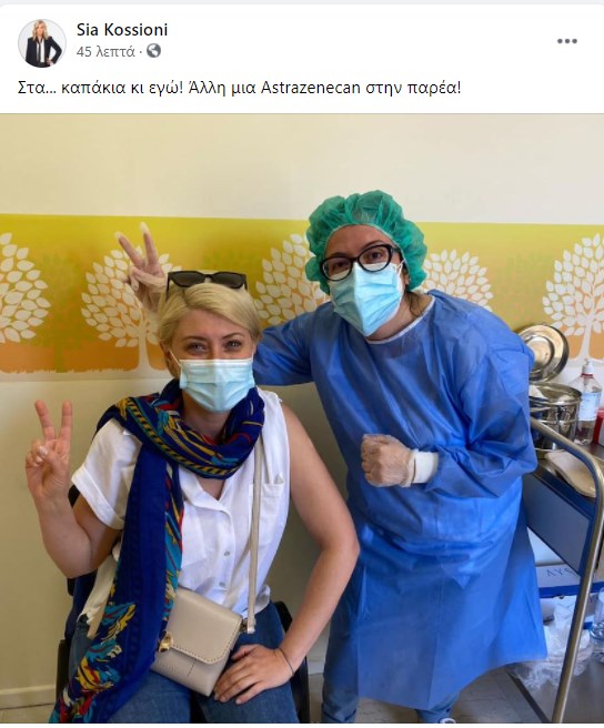 “Στα… καπάκια κι εγώ! Άλλη μια Astrazenecan στην παρέα!” έγραψε η Σία Κοσιώνη στη λεζάντα της φωτογραφίας που ανέβασε στο Facebook.