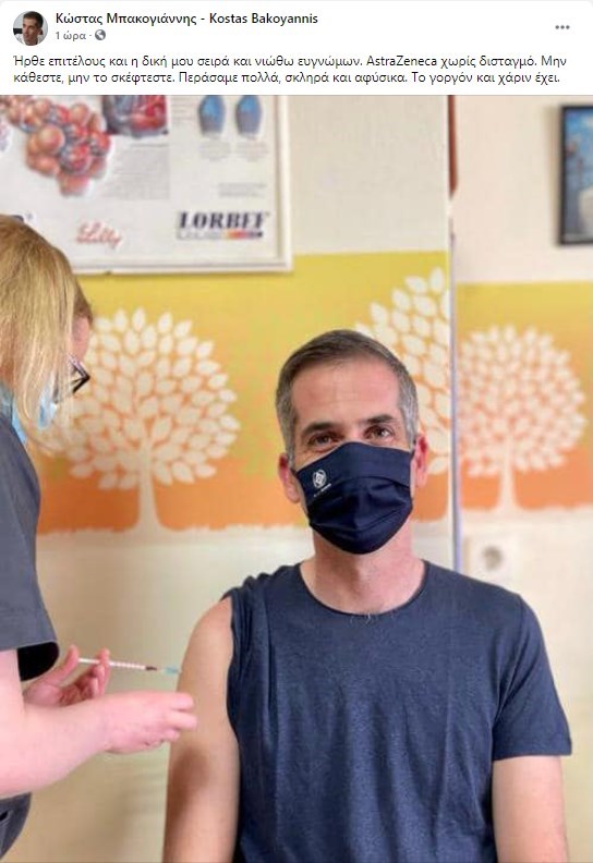 “Ήρθε επιτέλους και η δική μου σειρά και νιώθω ευγνώμων. AstraZeneca χωρίς δισταγμό. Μην κάθεστε, μην το σκέφτεστε. Περάσαμε πολλά, σκληρά και αφύσικα. Το γοργόν και χάριν έχει” είχε γράψει το Σάββατο στην ανάρτησή του ο Κώστας Μπακογιάννης ανεβάζοντας την παρακάτω φωτογραφία.