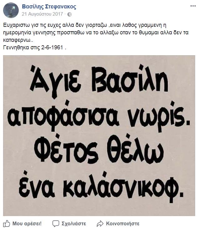 Λίγους μήνες πριν την εν ψυχρώ δολοφονία του, ο Βασίλης Στεφανάκος, είχε κάνει μία ανάρτηση στο facebook, στην οποία αναφερόταν στο όπλο με το οποίο τελικά, οι εκτελεστές του αφαίρεσαν τη ζωή.