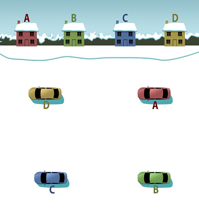 Έχεις τέσσερα αυτοκίνητα σταθμευμένα σε απόσταση το ένα από το άλλο έξω από ισάριθμα διαφορετικά σπίτια.