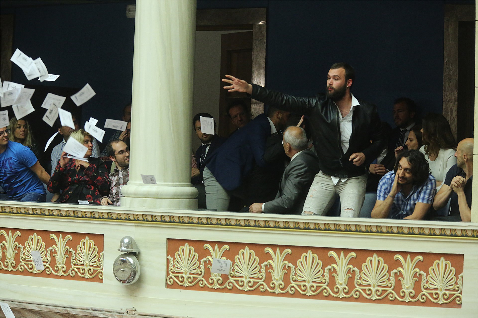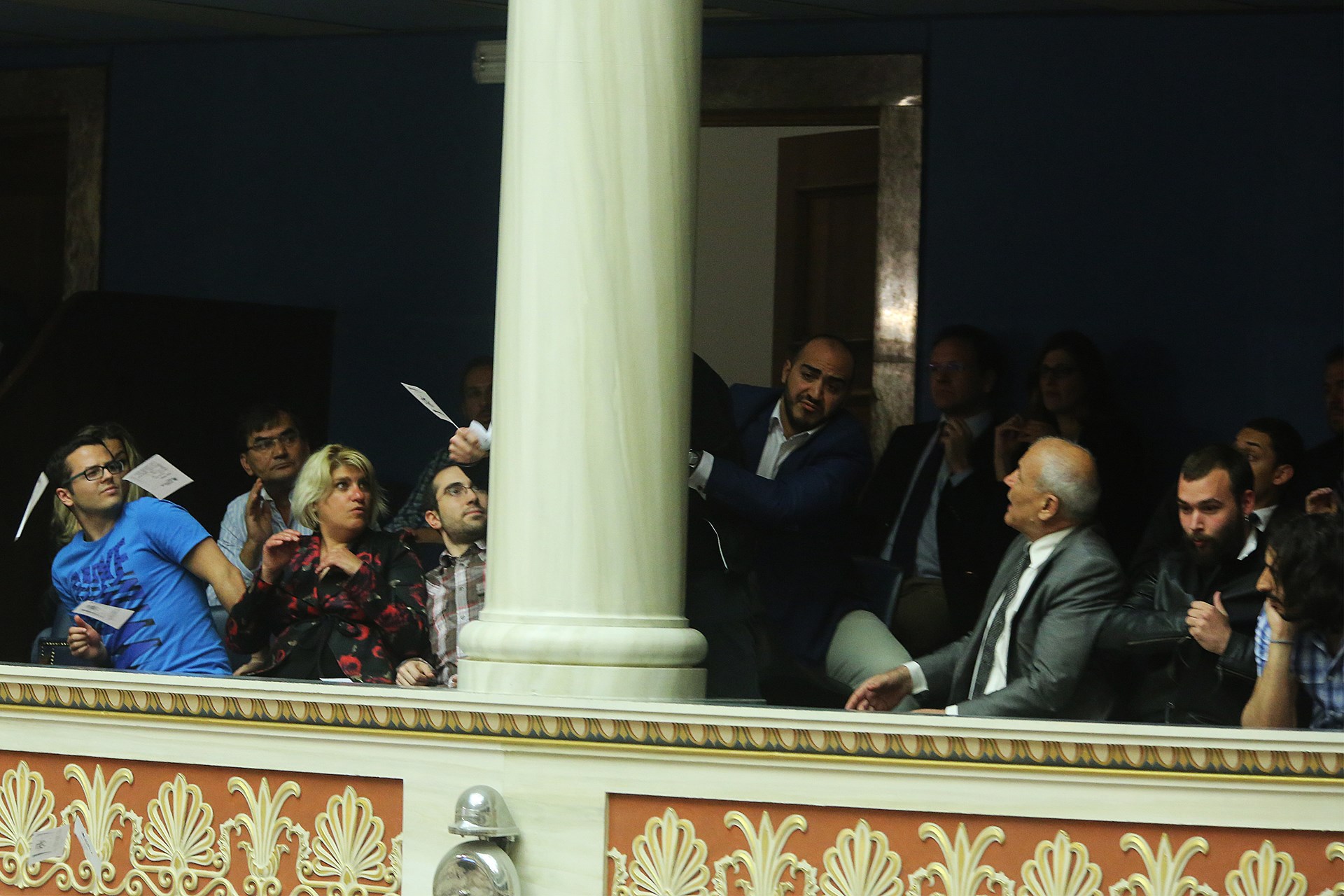 Νεολαίοι της Λαϊκής Ενότητας δήλωσαν οι τρεις νέοι, που από τα θεωρεία πέταξαν στην αίθουσα της Ολομέλειας χαρτιά για την περίοδο υπαγωγής στα μνημόνια. Οι τρεις νέοι οδηγήθηκαν από τη φρουρά της Βουλής εκτός των θεωρείων.Σε δημοσιογράφους που τους πλησίασαν είπαν ότι τα «επτά χρόνια είναι αρκετά» και αυτό ανέφεραν στα χαρτιά που πέταξαν στην Ολομέλεια την ώρα που στο βήμα βρισκόταν ο πρόεδρος της ΝΔ Κυριάκος Μητσοτάκης.