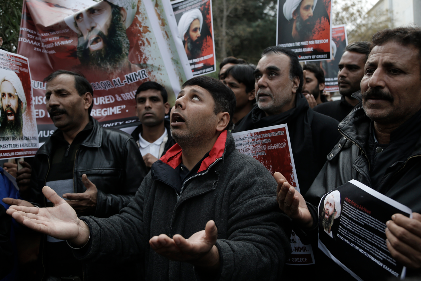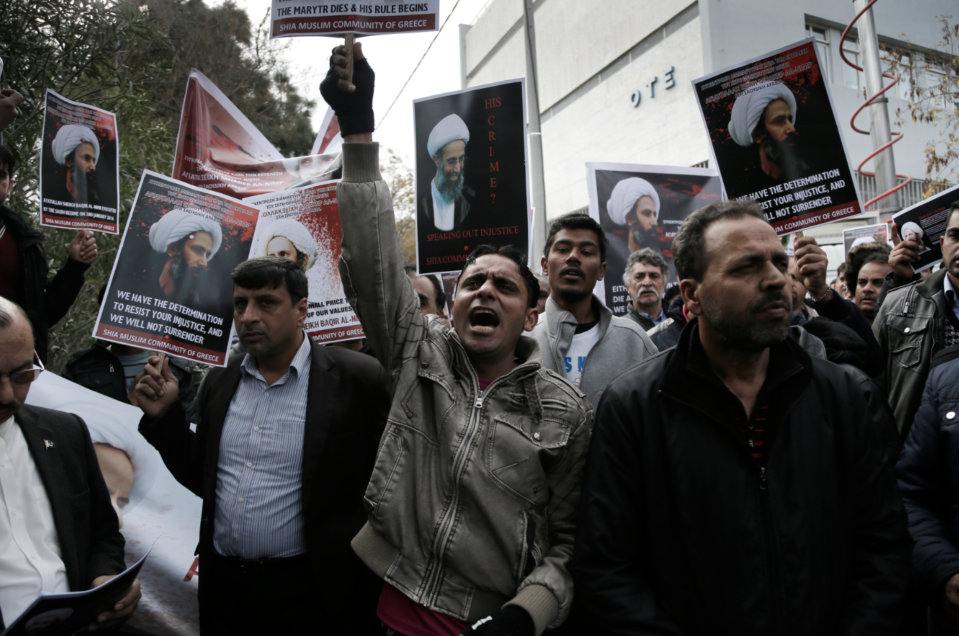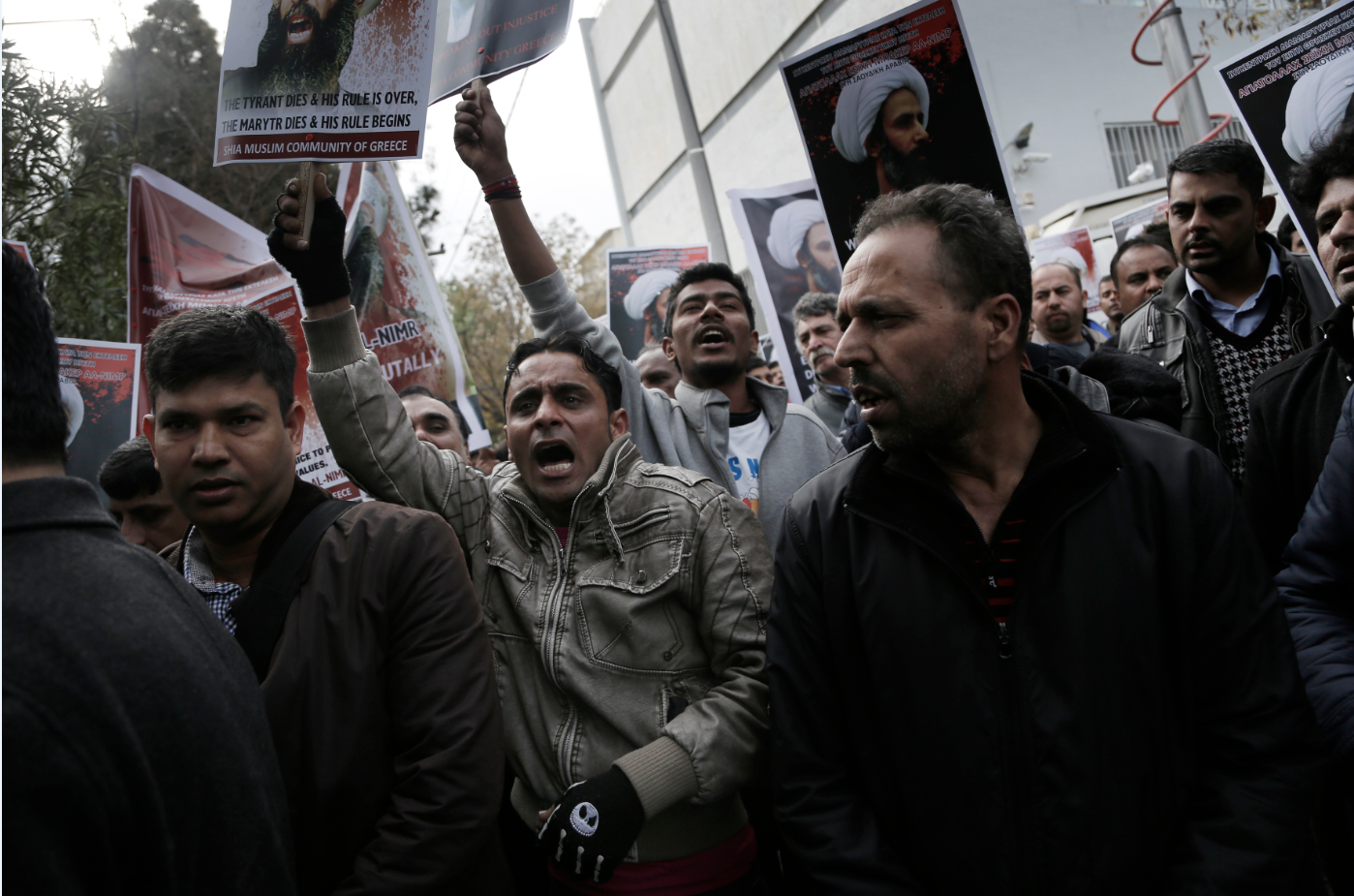 Σιίτες Μουσουλμάνοι που ζουν στη χώρα πήραν μέρος σε συγκέντρωση διαμαρτυρίας έξω από την πρεσβεία της Σαουδικής Αραβίας στην Αθήνα.