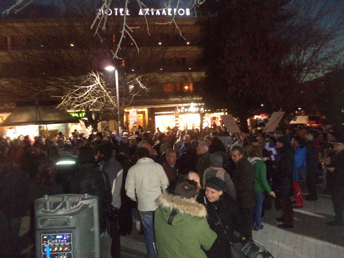 Όπως φαίνεται στις φωτογραφίες του trikalanews.gr, πλήθος διαδηλωτών βρίσκονται στην πλατεία Ρήγα Φεραίου κρατώντας πανό και ελληνικές σημαίες.