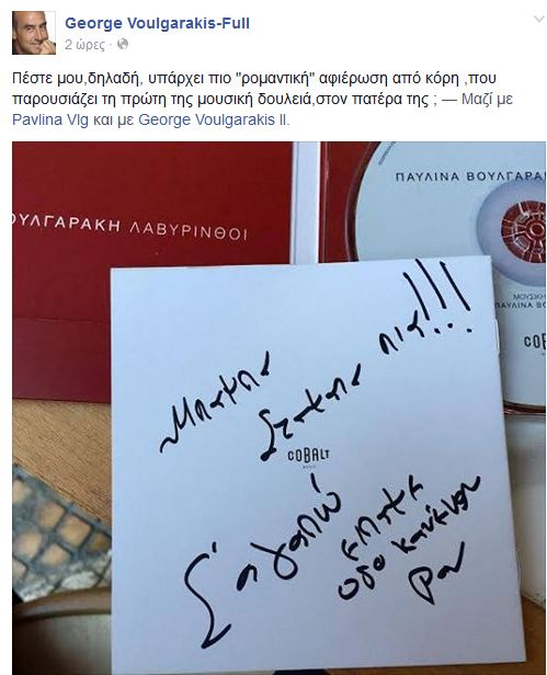 Την συγκίνηση του για την αφιέρωση που του έκανε η κόρη του, στην πρώτη της δισκογραφική δουλειά, εκδήλωσε ο Γιώργος Βουλγαράκης, με ανάρτηση του στο Facebook. Ο κ. Βουλγαράκης, έγραψε: «Πέστε μου, δηλαδή, υπάρχει πιο “ρομαντική” αφιέρωση από κόρη ,που παρουσιάζει τη πρώτη της μουσική δουλειά, στον πατέρα της ;», ενώ ανέβασε και φωτογραφία με την αφιέρωση της, η οποία έγραφε: «Μπαμπά σταμάτα πια. Σε αγαπάω είπαμε, όσο κανέναν».