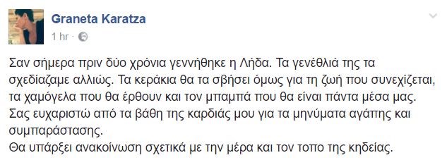 Συγκεκριμένα η Γρανέτα Καρατζά έγραψε: