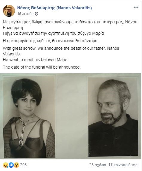 «Με μεγάλη μας θλίψη, ανακοινώνουμε το θάνατο του πατέρα μας, Νάνου Βαλαωρίτη. Πήγε να συναντήσει την αγαπημένη του σύζυγο Μαρία. Η ημερομηνία της κηδείας θα ανακοινωθεί σύντομα. With great sorrow, we announce the death of our father, Nanos Valaoritis. He went to meet his beloved Marie The date of the funeral will be announced», γράφουν , συνοδεύοντας την ανάρτησή τους με φωτογραφίες του ζευγαριού.