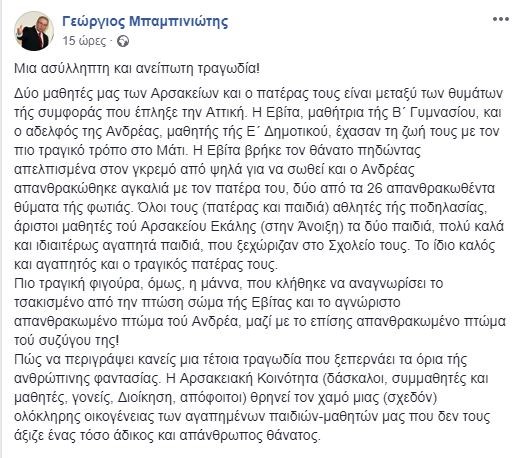 Δύο μαθητές μας των Αρσακείων και ο πατέρας τους είναι μεταξύ των θυμάτων τής συμφοράς που έπληξε την Αττική. Η Εβίτα, μαθήτρια τής Β΄ Γυμνασίου, και ο αδελφός της Ανδρέας, μαθητής τής Ε΄ Δημοτικού, έχασαν τη ζωή τους με τον πιο τραγικό τρόπο στο Μάτι. Η Εβίτα βρήκε τον θάνατο πηδώντας απελπισμένα στον γκρεμό από ψηλά για να σωθεί και ο Ανδρέας απανθρακώθηκε αγκαλιά με τον πατέρα του, δύο από τα 26 απανθρακωθέντα θύματα τής φωτιάς. Όλοι τους (πατέρας και παιδιά) αθλητές τής ποδηλασίας, άριστοι μαθητές τού Αρσακείου Εκάλης (στην Άνοιξη) τα δύο παιδιά, πολύ καλά και ιδιαιτέρως αγαπητά παιδιά, που ξεχώριζαν στο Σχολείο τους. Το ίδιο καλός και αγαπητός και ο τραγικός πατέρας τους.