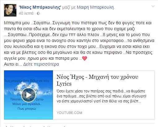 Συγκλονίζει με ανάρτησή του στο facebook ο γιος του Ανδρέα Μπάρκουλη αναφερόμενος στους οκτώ μήνες που έχουν περάσει από τον θάνατο του πατέρα του.Το post του Νικόλα Μπάρκουλη προκάλεσε συγκίνηση στους διαδικτυακούς του φίλους.Μπαμπά μου… Σ’αγαπώ… Συγγνώμη που πίστεψα πως δεν θα φύγεις ποτέ και πάντα θα είσαι εδώ και δεν εκμεταλλεύτηκα το χρόνο που είχαμε μαζί…», αναφέρει στην ανάρτησή του ο γιος του μεγάλου ηθοποιού. «Σε αγαπάω… Πρόσεχέ με… Δεν έχω τίποτε άλλο πλέον», συμπληρώνει και καταλήγει: «8 μήνες και το μόνο που μου φέρνει χαρά είναι το ανοιχτό σου καντήλι στο νεκροταφείο… Τα ανθισμένα σου λουλούδια και η εικόνα σου στον τοίχο μου… Εύχομαι να είσαι καλά εκεί και να με βλέπεις όσο θα μεγαλώνω και θα σε κάνω περήφανο ..Να προσέχεις άγγελε μου, ήρωα μου και πατέρα μου…»