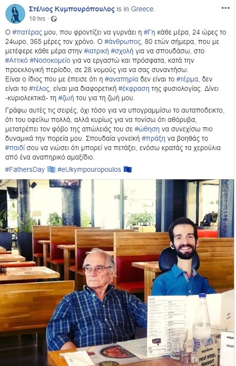 “Είναι ο ίδιος που με έπεισε ότι η αναπηρία δεν είναι το τέρμα, δεν είναι το τέλος, είναι μια διαφορετική έκφραση της φυσιολογίας. Δίνει -κυριολεκτικά- τη ζωή του για τη ζωή μου. Γράφω αυτές τις σειρές, όχι τόσο για να υπογραμμίσω το αυταποδεικτο, ότι του οφείλω πολλά, αλλά κυρίως για να τονίσω ότι αθόρυβα, μετατρέπει τον φόβο της απώλειάς του σε ώθηση να συνεχίσω πιο δυναμικά την πορεία μου. Σπουδαία γονεϊκή πράξη να βοηθάς το παιδί σου να νιώσει ότι μπορεί να πετάξει, ενόσω κρατάς τα χερούλια από ένα αναπηρικό αμαξίδιο” καταλήγει.