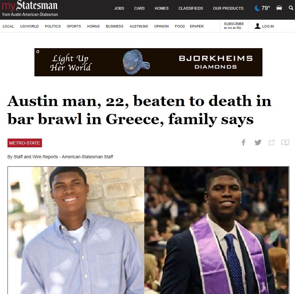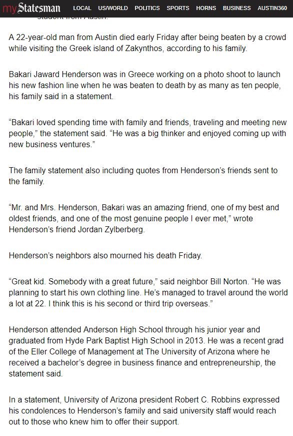 Η οικογένεια του 22χρονου Αμερικανού έδωσε γραπτή δήλωση στην ιστοσελίδα mystatesman.com, στην οποία αναφέρει ότι ο Bakari Jaward Henderson είχε έρθει στην Ελλάδα προκειμένου να εργαστεί για τη φωτογράφηση της νέας του συλλογής μόδας.