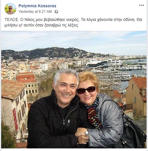 “ΤΕΛΟΣ. Ο Νίκος μου βεβαιώθηκε νεκρός. Τα λόγια χάνονται στην οδύνη. Θα μιλήσω γι’ αυτόν όταν ξαναβρώ τις λέξεις” γράφει η Πολυμνία Κοσσόρα.