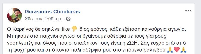 «Ο καρκίνος δε σηκώνει like. Έκτος χρόνος, κάθε εξέταση καινούργια αγωνία. Μπήκαμε στο παιχνίδι άγνωστοι βγαίνουμε αδέρφια με τους γιατρούς νοσηλευτές και όλους που στο καθήκον τους είναι η ΖΩΗ. Σας ευχαριστώ από τη ψυχή μου και από κοντά πάλι αδέρφια μου στο επόμενο ραντεβού».