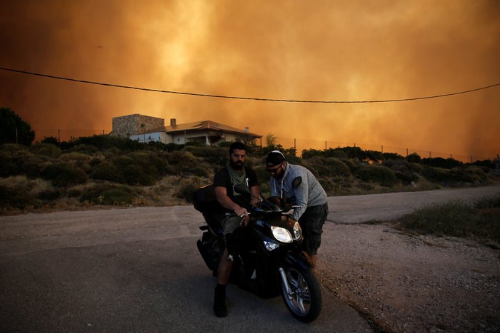 Μία συγκλονιστική φωτογραφία, από το Reuters, δείχνει δύο άνδρες έχοντας μαζί τους έναν σκύλο, πάνω σε μία μοτοσικλέτα, να απομακρύνονται από το μέτωπο της πυρκαγιάς, το οποίο μοιάζει να τους “κυνηγά” απειλητικά.