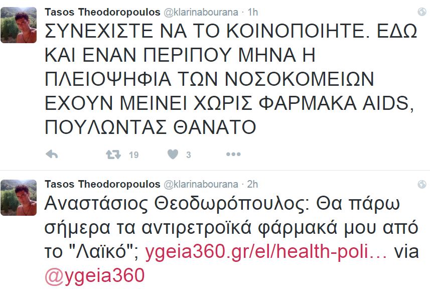 Συγκλονίζει η καταγγελία του οροθετικού δημοσιογράφου Τάσου Θεοδωρόπουλου ότι εδώ και τρεις εβδομάδες έχει διακόψει την λήψη των αντιρετροϊκών φαρμάκων, καθώς το φαρμακείο του «Λαϊκού» έχει εξαντλήσει τα αποθέματά του.