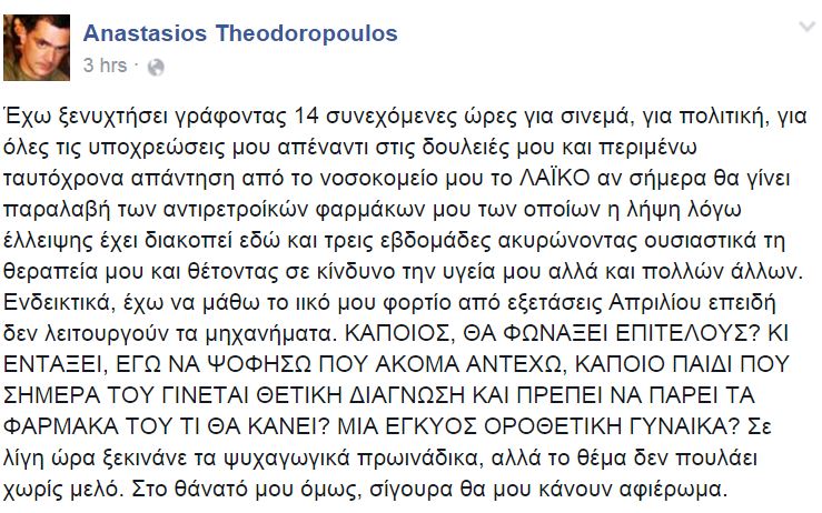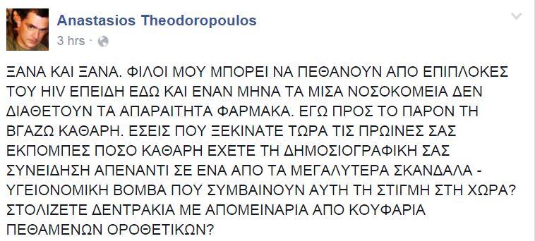 Ο δημοσιογράφος με πολλαπλά μηνύματα, μέσω του προσωπικού του λογαριασμού στο Facebook και στο twitter, απευθύνει έκκληση τους αρμόδιους καθώς όπως αναφέρει «φίλοι μου μπορεί να πεθάνουν από επιπλοκές του HIV επειδή εδώ και έναν μήνα τα μισά νοσοκομεία δεν διαθέτουν τα απαραίτητα φάρμακα».