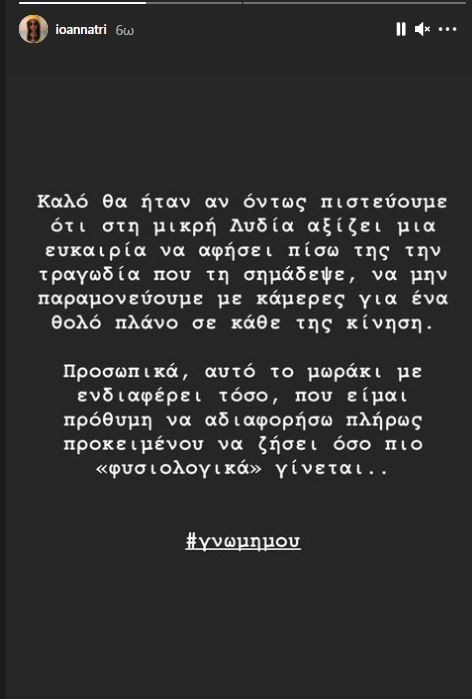 Τις τελευταίες εξελίξεις σχολίασε με ανάρτησή της στο Instagram η Ιωάννα Τριανταφυλλίδου, η οποία κάλεσε τα ΜΜΕ να μην παραμονεύουν για ένα πλάνο της μικρής Λυδίας και να την αφήσουν να ζήσει όσο πιο φυσιολογικά γίνεται.