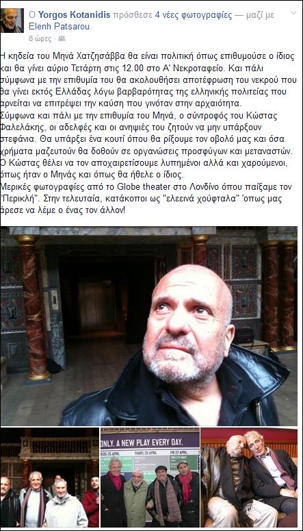 Ο Γιώργος Κοτανίδης με ανάρτηση στην προσωπική του σελίδα στο Facebook αναφέρθηκε στην τελευταία επιθυμία του Μηνά Χατζησάββα, ενώ ανέβασε και φωτογραφίες από τη συνεργασία τους στο Globe theater του Λονδίνου, όπου είχαν παίξει τον «Περικλή».