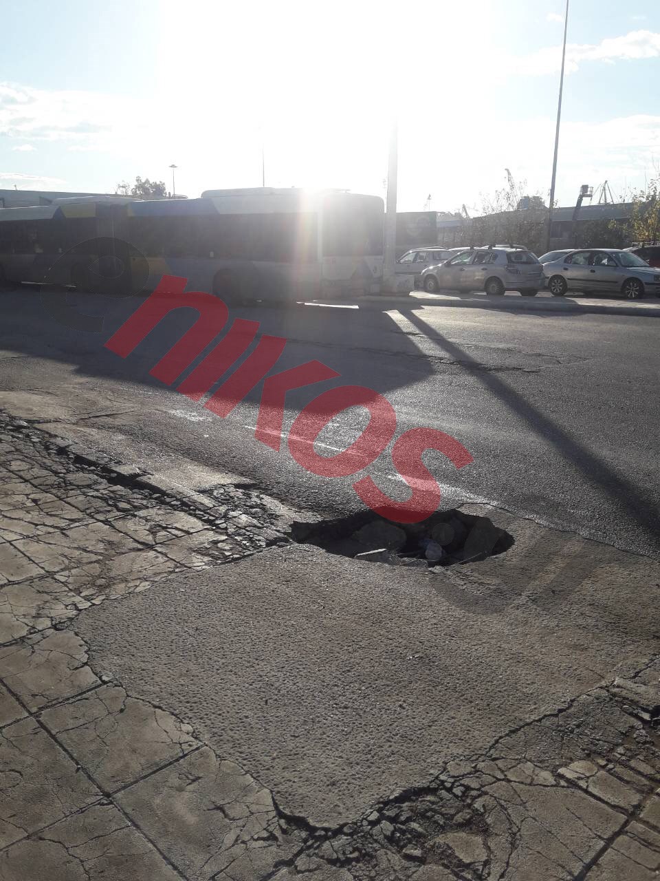 Μία επικίνδυνη τρύπα έχει ανοίξει στο οδόστρωμα που βρίσκεται στο τέρμα των λεωφορείων Περάματος.