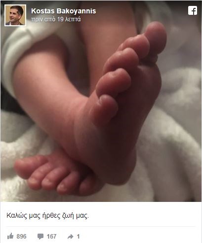 «Καλώς μας ήρθες στη ζωή μας», ήταν το μήνυμα του κ. Μπακογιάννη, το οποίο συνόδευε τη φωτογραφία που δημοσίευσε στο Facebook.