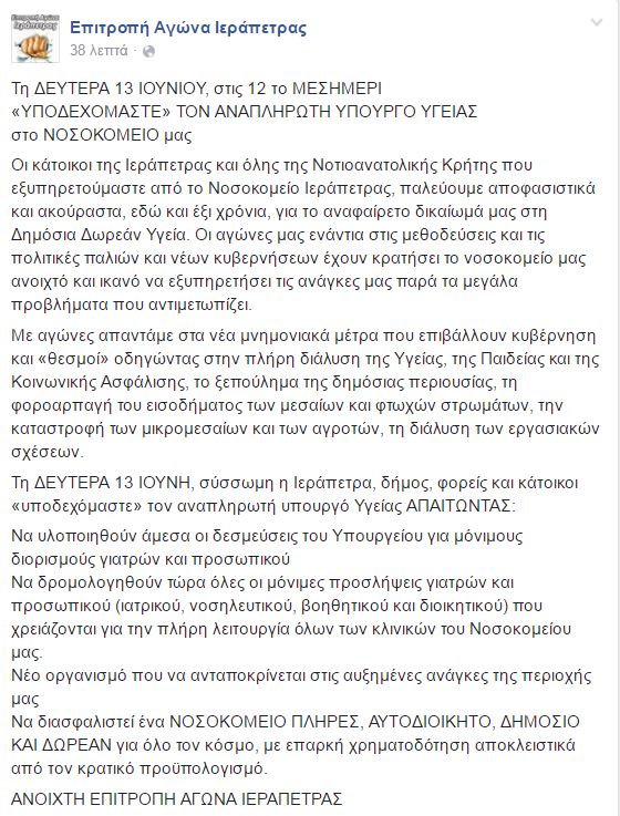 Οι κάτοικοι της Ιεράπετρας και όλης της Νοτιοανατολικής Κρήτης που εξυπηρετούμαστε από το Νοσοκομείο Ιεράπετρας, παλεύουμε αποφασιστικά και ακούραστα, εδώ και έξι χρόνια, για το αναφαίρετο δικαίωμά μας στη Δημόσια Δωρεάν Υγεία. Οι αγώνες μας ενάντια στις μεθοδεύσεις και τις πολιτικές παλιών και νέων κυβερνήσεων έχουν κρατήσει το νοσοκομείο μας ανοιχτό και ικανό να εξυπηρετήσει τις ανάγκες μας παρά τα μεγάλα προβλήματα που αντιμετωπίζει.