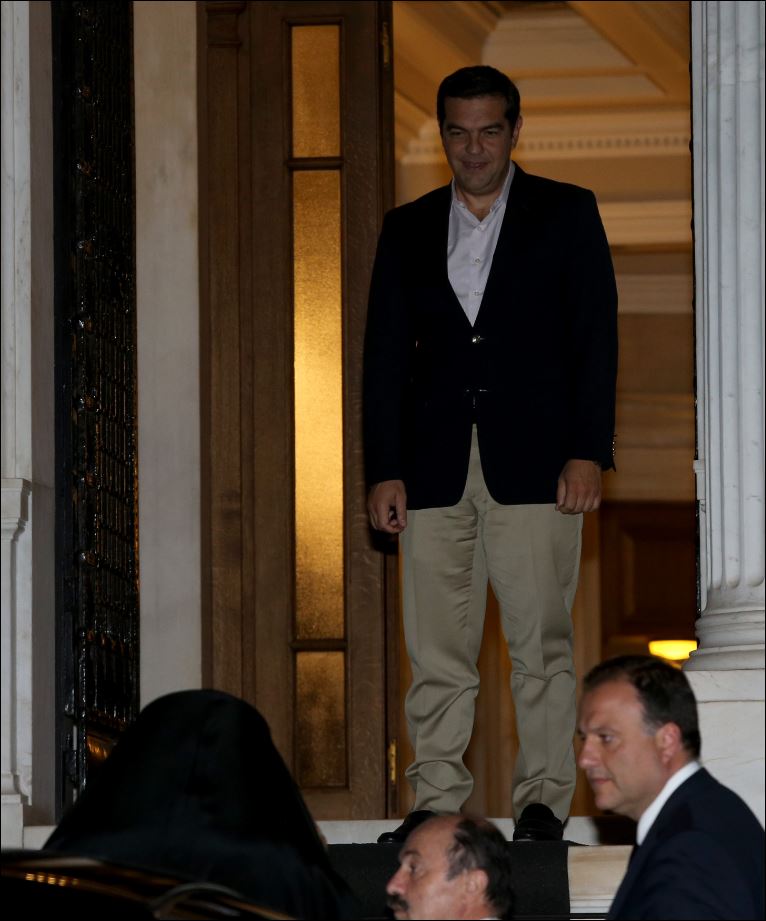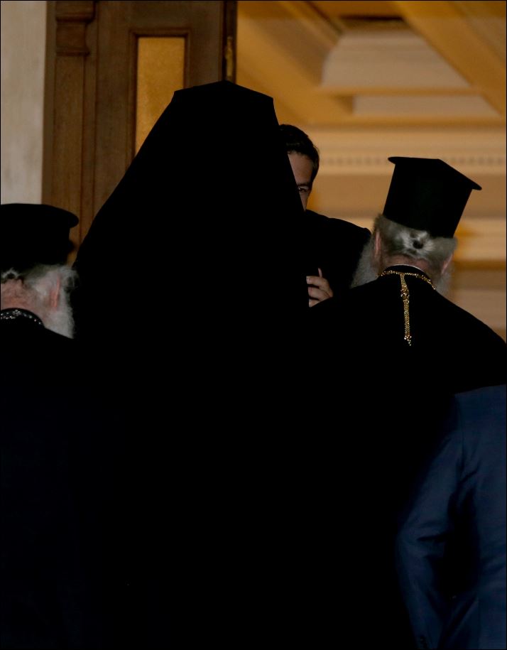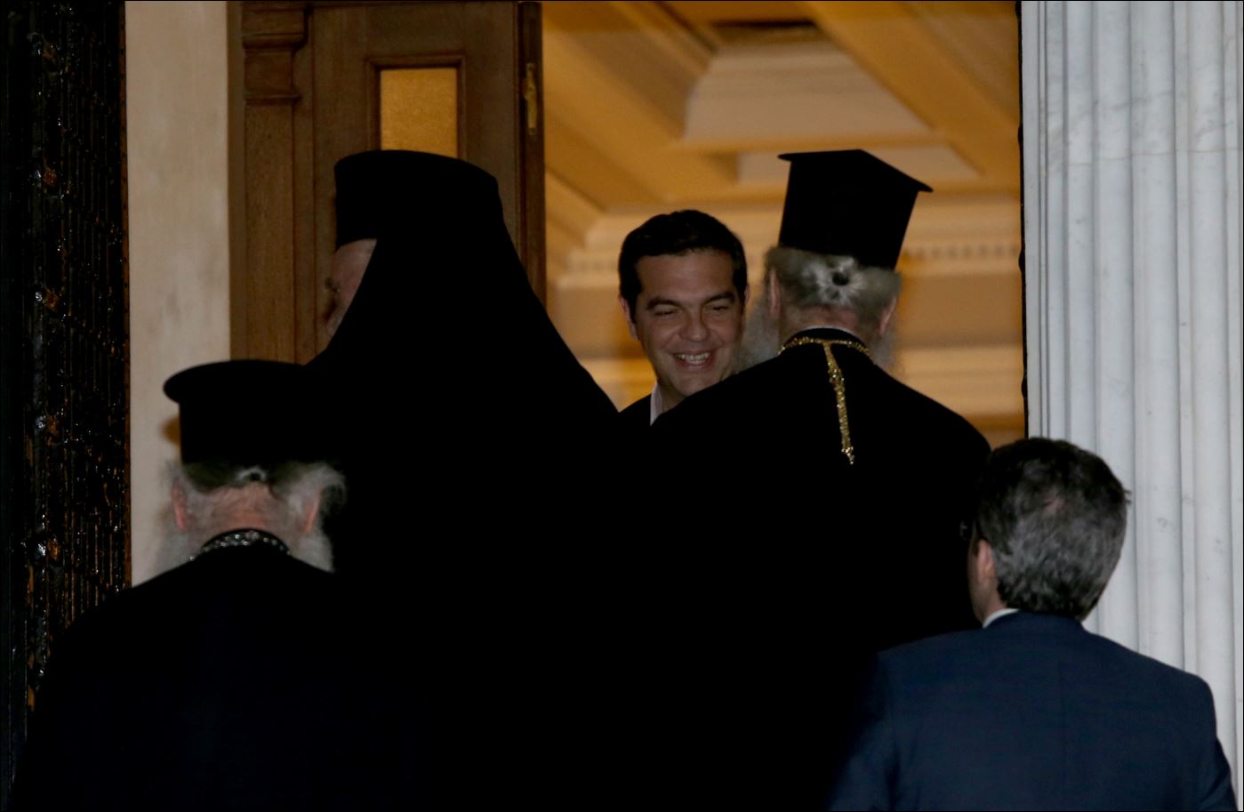 Λίγο πριν τις 8 το βράδυ ο Αρχιεπίσκοπος Ιερώνυμος, συνοδευόμενος από τους Μητροπολίτες Σπάρτης Ευστάθιο, Φθιώτιδος Νικόλαο, Μεσογαίας Νικόλαο και τον νομικό σύμβουλο της Ιεράς Συνόδου Θεόδωρο Παπαγεωργίου πέρασαν το κατώφλι του Μεγάρου Μαξίμου.