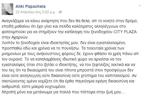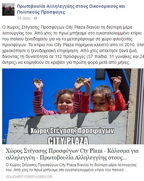 “Ο Χώρος Στέγασης Προσφύγων City Plaza διανύει τη δεύτερη μέρα λειτουργίας του. Από χτες το πρωί μπήκαμε στο εγκαταλελειμμένο κτίριο του παλιού ξενοδοχείου για να το μετατρέψουμε σε χώρο φιλοξενίας προσφύγων. To κτίριο του City Plaza παρέμενε κλειστό από το 2010, όταν χρεοκόπησε η ξενοδοχειακή επιχείρηση. Από χτες απέκτησε ξανά ζωή, δίνοντας τη δυνατότητα σε 112 πρόσφυγες (57 παιδιά, 31 γυναίκες και 24 άντρες) να κοιμηθούν σε κρεβάτι για πρώτη φορά μετά από μήνες”.