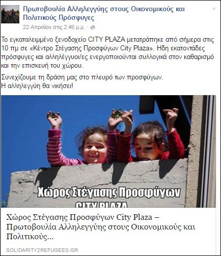 “Το εγκαταλειμμένο ξενοδοχείο CITY PLAZA μετατράπηκε από σήμερα στις 10 πμ σε «Κέντρο Στέγασης Προσφύγων City Plaza». Ήδη εκατοντάδες πρόσφυγες και αλληλέγγυoι/ες ενεργοποιούνται συλλογικά στον καθαρισμό και την επισκευή του χώρου.