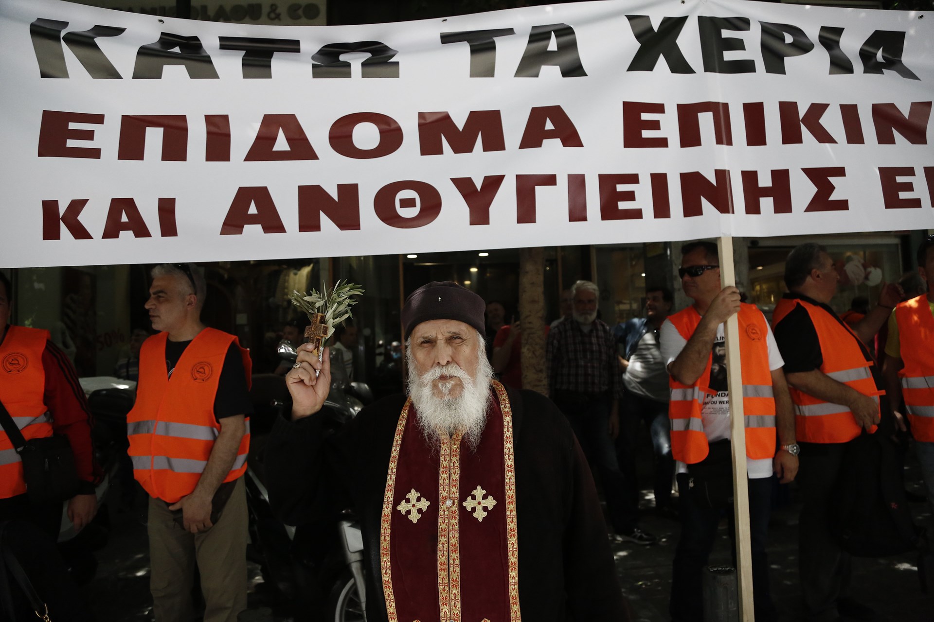 Εκτός από μέλη της ΑΔΕΔΥ και της ΠΟΕΔΗΝ, στη διαδήλωση συμμετείχε και ένας… παπάς, ο οποίος ράντιζε με αγιασμό τον δρόμο που πραγματοποιήθηκε η πορεία. Ο παπά-Χρήστος δηλώνει εκτός από ιερέας, ποιητής και ζωγράφος.