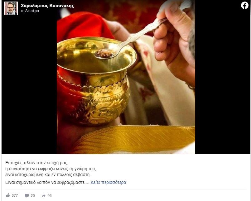 Με ένα κείμενο που δημοσίευσε στα μέσα κοινωνικής δικτύωσης ένας ιερέας από την Κρήτη παίρνει θέση για την μετάδοση του Covid19 μέσα από την Θεία Κοινωνία.