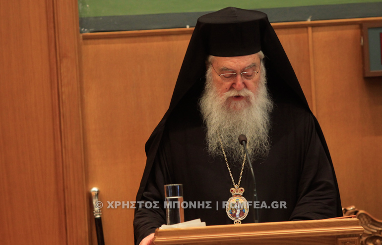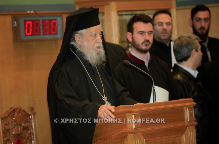Τον Μακαριώτατο παρασημοφόρησε ο Αντιπρόεδρος της Ιεραρχίας Σεβασμιώτατος Μητροπολίτης Καρυστίας κ. Σεραφείμ, ο οποίος αναφέρθηκε στην όλη πορεία του Μακαριωτάτου μέχρι σήμερα.