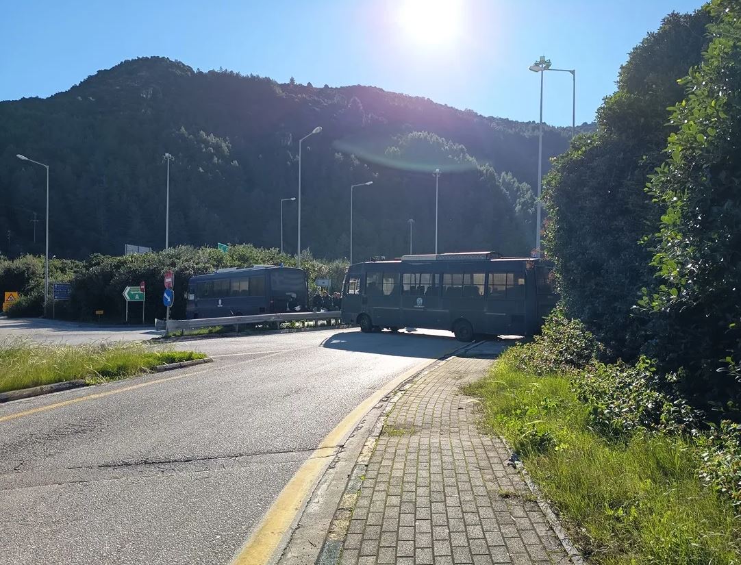 Η αστυνομία έχει αποκλείσει τον δρόμο με διπλό μπλόκο, περιπολικό και κλούβες στην είσοδο.