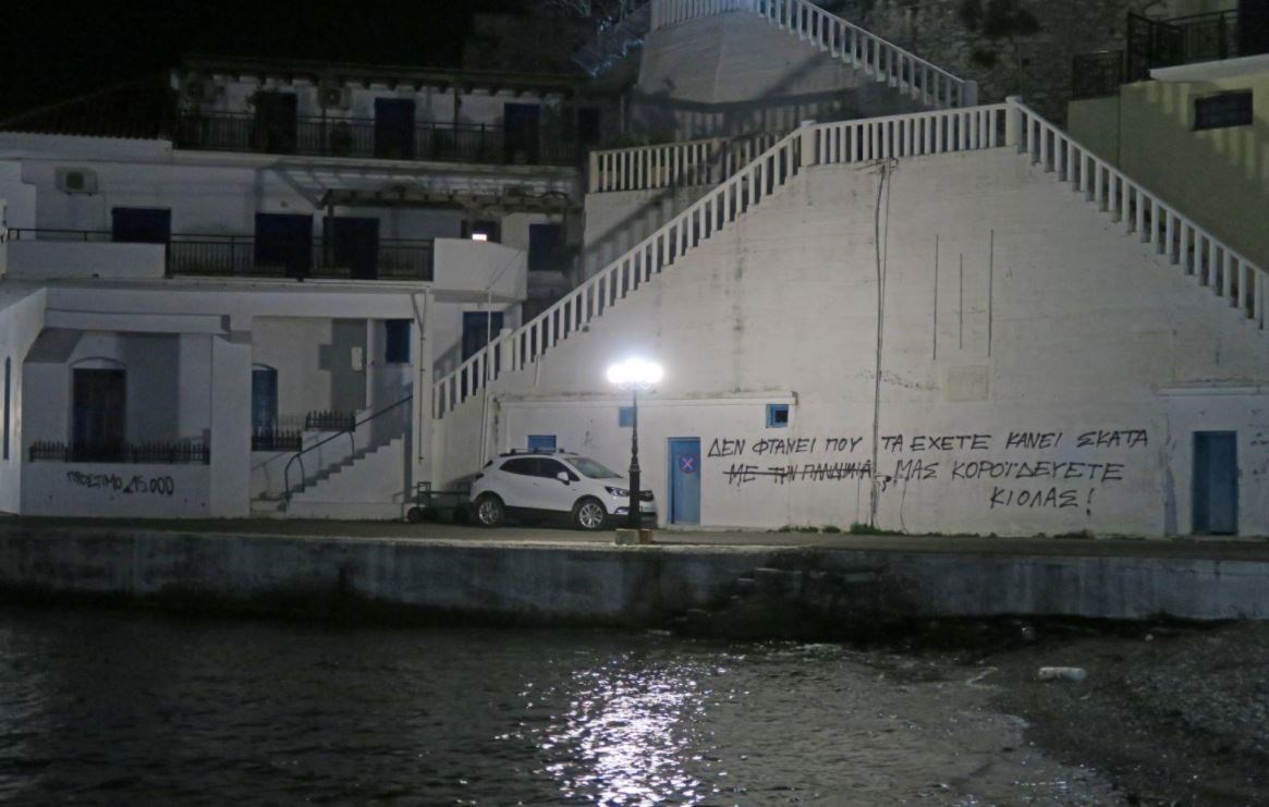 Οι άγνωστοι έγραψαν την Τρίτη το βράδυ στους τοίχους του σπιτιού τα συνθήματα “πρόστιμο 15.000” και “Δεν φτάνει που τα έχετε κάνει σκ@τ@ με την πανδημία μας κοροϊδεύετε κιόλας”. Την Τετάρτη το πρωί συνεργείο καθαρισμού ξεκίνησε τις εργασίες για να σβηστούν τα συνθήματα.