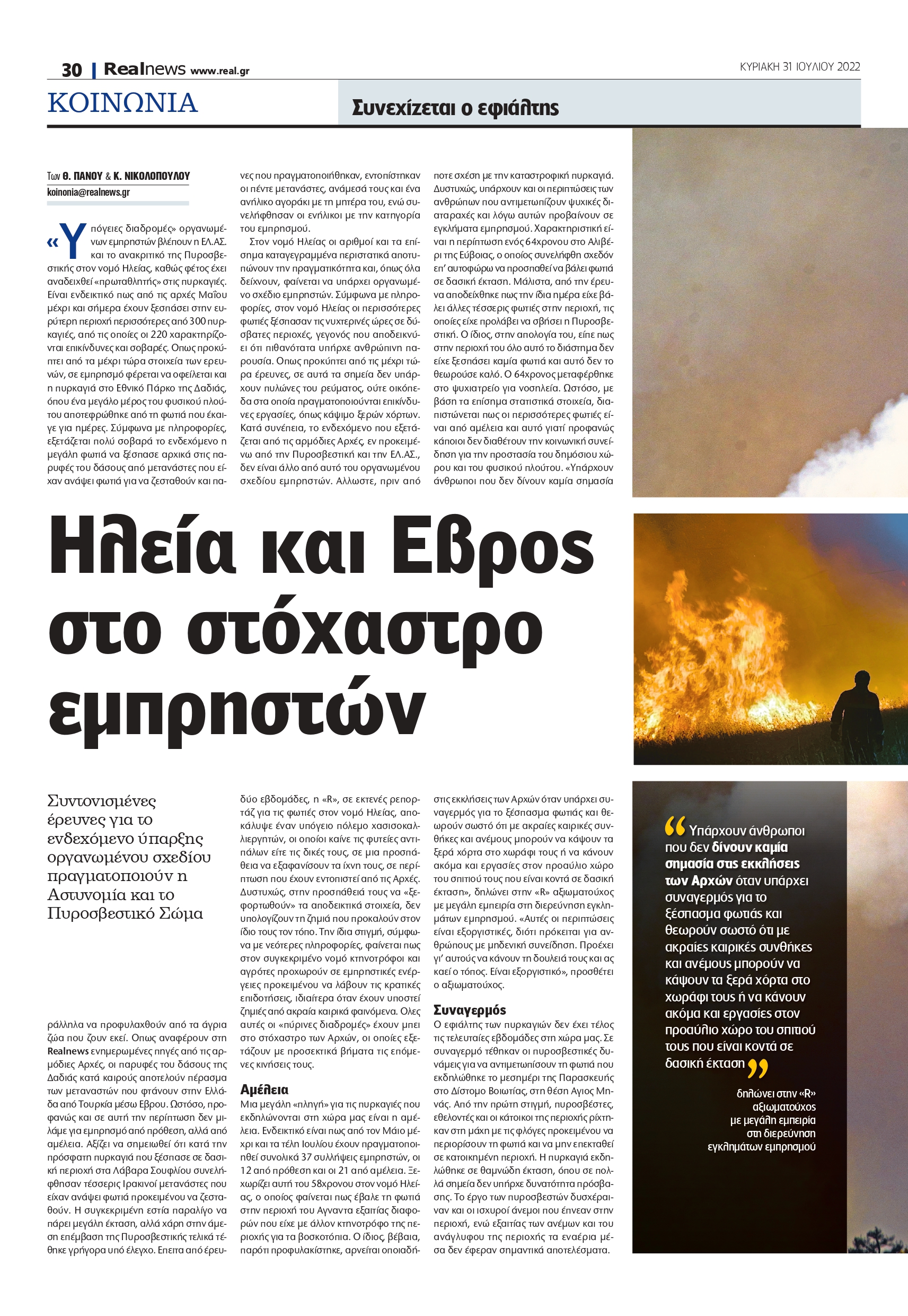 «Υπόγειες διαδρομές» οργανωμένων εμπρηστών βλέπουν η ΕΛ.ΑΣ. και το ανακριτικό της Πυροσβεστικής στον νομό Ηλείας, καθώς φέτος έχει αναδειχθεί «πρωταθλητής» στις πυρκαγιές. Είναι ενδεικτικό πως από τις αρχές Μαΐου μέχρι και σήμερα έχουν ξεσπάσει στην ευρύτερη περιοχή περισσότερες από 300 πυρκαγιές, από τις οποίες οι 220 χαρακτηρίζονται επικίνδυνες και σοβαρές.