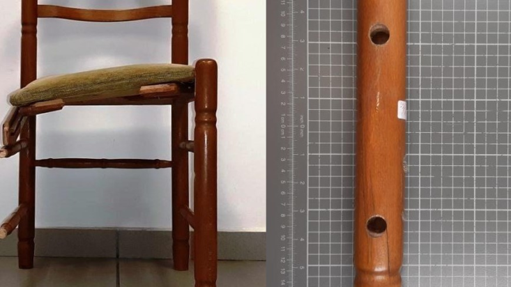 Μία ξύλινη καρέκλα, καφέ χρώματος, με ίχνη πρόσφατης απόσπασης, ενός εκ των δύο εμπρόσθιων ποδιών,