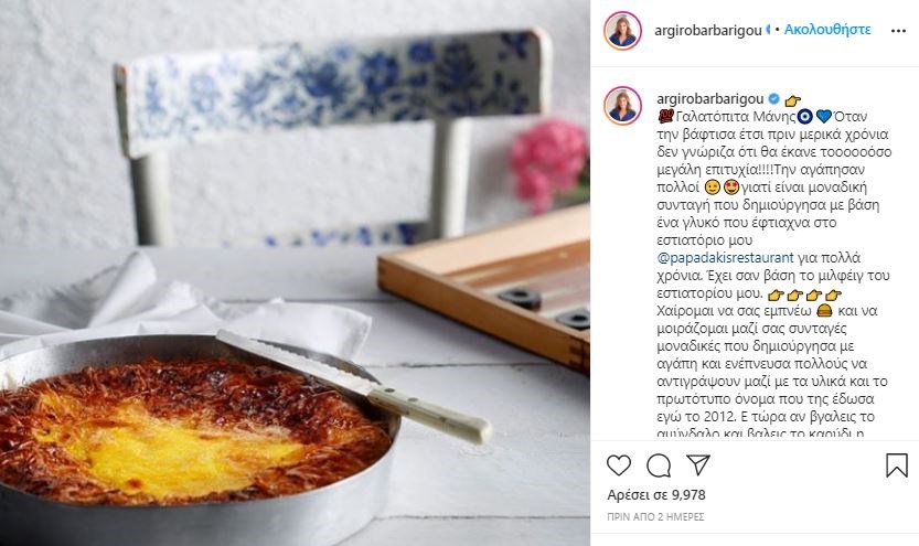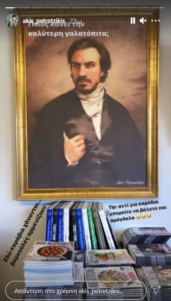 Ο Άκης Πετρετζίκης έδωσε τη δική του απάντηση μέσω ενός Instastory. Στην ανάρτηση απεικονίζεται ο ίδιος σε έναν πίνακα και αναρωτιέται “Ποιος κάνει την καλύτερη γαλατόπιτα” και τη συνοδεύει με τη λεζάντα “εδώ καράβια χάνονται, βαρκούλες αρμενίζουν”. Ο Άκης Πετρετζίκης έδωσε και συμβουλές για την συγκεκριμένη συνταγή “Tip: Αντί για καρύδια μπορείτε να βάλετε και αμύγδαλα”.