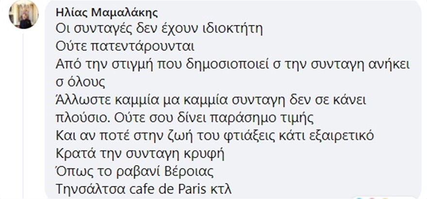 “Οι συνταγές δεν έχουν ιδιοκτήτη. Ούτε πατεντάρουνται. Από την στιγμή που δημοσιοποιείς την συνταγή ανήκει σ όλους’, έγραψε ο Ηλίας Μαμαλάκης και πρόσθεσε: “