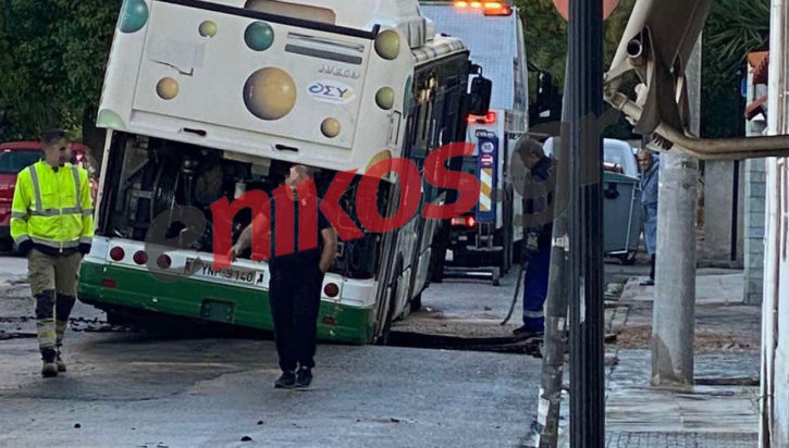 Όπως φαίνεται στις φωτογραφίες που έστειλε αναγνώστης στο enikos.gr, άνοιξε ξαφνικά ο δρόμος και το λεωφορείο βρέθηκε μέσα στην τρύπα καθώς δεν πρόλαβε να περάσει.