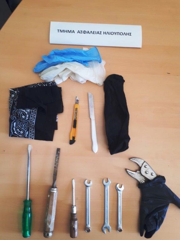 Στην κατοχή τους βρέθηκαν και κατασχέθηκαν διαρρηκτικά εργαλεία, πλαστική κάρτα, γάντια μιας χρήσης, ζευγάρι κάλτσες, μαντήλι προσώπου καθώς και τα αφαιρεθέντα αντικείμενα.
