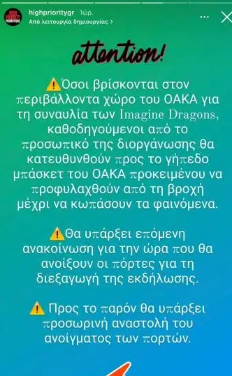 Αξίζει να σημειωθεί πως νωρίτερα η εταιρεία πραγματοποίησε ανακοίνωση για την συναυλία στην οποία αναφέρει πως το κοινό θα πρέπει να κατευθυνθεί προς το γήπεδο μπάσκετ του ΟΑΚΑ προκειμένου να προφυλαχθεί από τη βροχή μέχρι να κοπάσουν τα φαινόμενα.
