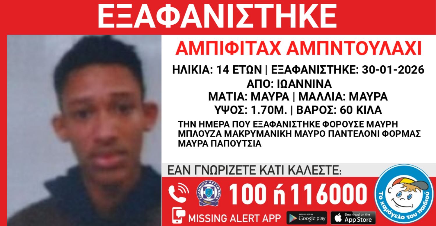 «Στις 30/01/2026 στις 18:00 εξαφανίστηκε από χώρο φιλοξενίας ασυνόδευτων ανηλίκων στην περιοχή των Ιωαννίνων o (επ.) ABDULAHI ABDIFITAH(ον) 14 ετών, σομαλικής καταγωγής. Το «Χαμόγελο του Παιδιού» ενημερώθηκε και προχώρησε σε δημοσιοποίηση των στοιχείων του ανήλικου, κατόπιν εισαγγελικής εντολής καθώς