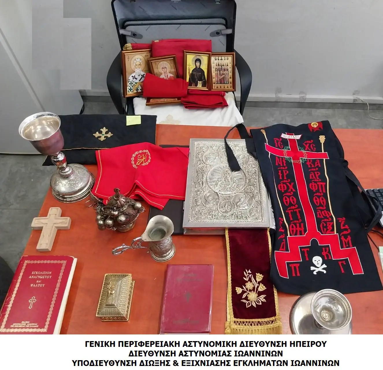 Ο 47χρονος φέρεται ότι εξαπατούσε πολίτες με διάφορες υποσχέσεις, ενώ η έρευνα που ακολούθησε αποκάλυψε στοιχεία που ενισχύουν τη δικογραφία. Οι αστυνομικοί διενήργησαν έρευνα στο συγκεκριμένο σπίτι και εντόπισαν λειτουργικά εκκλησιαστικά σκεύη, ιερατικά άμφια και εικόνες, τα οποία κατέσχεσαν.
