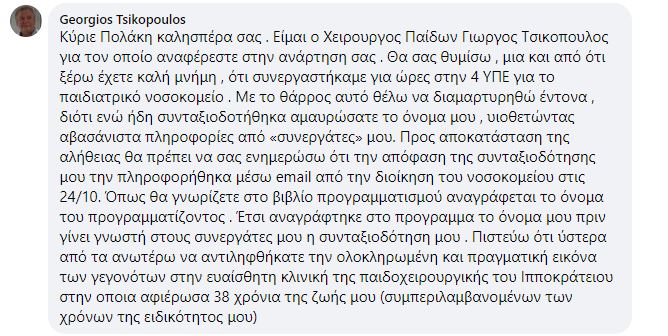 «Κύριε Πολάκη καλησπέρα σας . Είμαι ο Χειρουργος Παίδων Γιωργος Τσικοπουλος για τον οποίο αναφέρεστε στην ανάρτηση σας . Θα σας θυμίσω , μια και από ότι ξέρω έχετε καλή μνήμη , ότι συνεργαστήκαμε για ώρες στην 4 ΥΠΕ για το παιδιατρικό νοσοκομείο . Με το θάρρος αυτό θέλω να διαμαρτυρηθώ έντονα , διότι ενώ ήδη συνταξιοδοτήθηκα αμαυρώσατε το όνομα μου , υιοθετώντας αβασάνιστα πληροφορίες από «συνεργάτες» μου. Προς αποκατάσταση της αλήθειας θα πρέπει να σας ενημερώσω ότι την απόφαση της συνταξιοδότησης μου την πληροφορήθηκα μέσω email από την διοίκηση του νοσοκομείου στις 24/10. Όπως θα γνωρίζετε στο βιβλίο προγραμματισμού αναγράφεται το όνομα του προγραμματίζοντος . Έτσι αναγράφτηκε στο πρόγραμμα το όνομα μου πριν γίνει γνωστή στους συνεργάτες μου η συνταξιοδότηση μου . Πιστεύω ότι ύστερα από τα ανωτέρω να αντιληφθήκατε την ολοκληρωμένη και πραγματική εικόνα των γεγονότων στην ευαίσθητη κλινική της παιδοχειρουργικής του Ιπποκράτειου στην οποία αφιέρωσα 38 χρόνια της ζωής μου (συμπεριλαμβανομένων των χρόνων της ειδικότητος μου)».