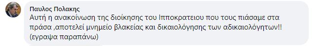 Ο γιατρός που κατά τον βουλευτή του ΣΥΡΙΖΑ παρατύπως βρισκόταν στο πρόγραμμα χειρουργείων, απάντησε κάτω από την ανάρτηση του Παύλου Πολάκη. Ο γιατρός διαμαρτύρεται έντονα, διότι «ενώ ήδη συνταξιοδοτήθηκα αμαυρώσατε το όνομα μου , υιοθετώντας αβασάνιστα πληροφορίες από “συνεργάτες” μου».