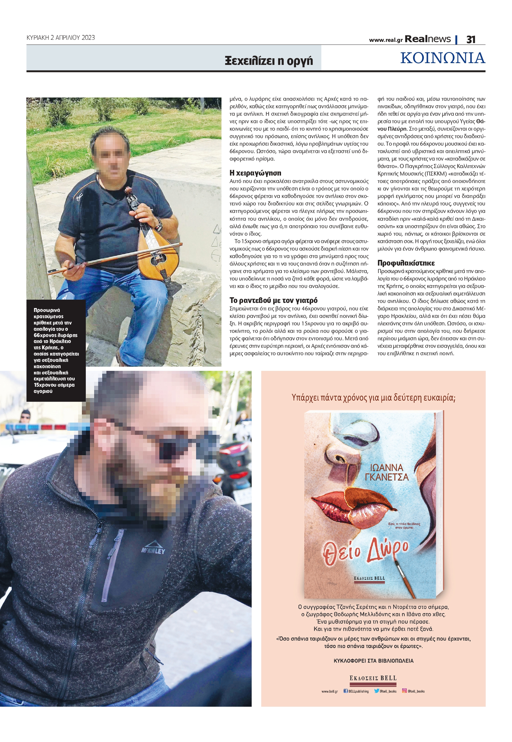 Παράλληλα, στο μικροσκόπιο των Αρχών έχει μπει και άλλη μία υπόθεση που αφορά τον 66χρονο. Συγκεκριμένα, ο λυράρης είχε απασχολήσει τις Αρχές κατά το παρελθόν, καθώς είχε κατηγορηθεί πως αντάλλασσε μηνύματα με ανήλικη. Η σχετική δικογραφία είχε σχηματιστεί μήνες πριν και ο ίδιος είχε υποστηρίξει τότε -ως προς τις επικοινωνίες του με το παιδί- ότι το κινητό το χρησιμοποιούσε συγγενικό του πρόσωπο, επίσης ανήλικος. Η υπόθεση δεν είχε προχωρήσει δικαστικά, λόγω προβλημάτων υγείας του 66χρονου. Ωστόσο, τώρα, αναμένεται να εξεταστεί υπό διαφορετικό πρίσμα.