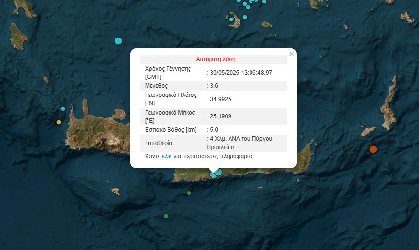 Ακολούθησε και νέα δόνηση, ύστερα από τρία λεπτά. Ο σεισμός είχε ένταση 3,6 βαθμών της κλίμακας Ρίχτερ, ενώ το επίκεντρο εντοπίζεται 4 χιλιόμετρα ανατολικά νοτιοανατολικά του Πύργου Ηρακλείου και το εστιακό βάθος στα 5 χιλιόμετρα, σύμφωνα με την αυτόματη λύση του Γεωδυναμικού Ινστιτούτου.