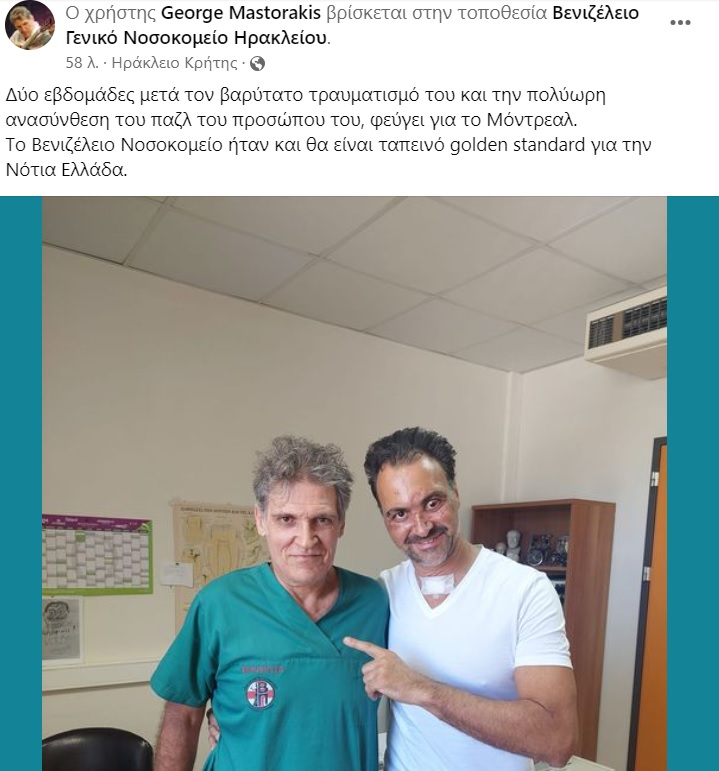 Μάλιστα, ο γναθοχειρουργός Γιώργος Μαστοράκης, που ήταν ένας από τους θεράποντες γιατρούς του 49χρονου, προχώρησε σε μία ανάρτηση φωτογραφίας με τον Ελληνοκαναδό, η οποία συνοδεύεται από το παρακάτω κείμενο: «Δύο εβδομάδες μετά τον βαρύτατο τραυματισμό του και την πολύωρη ανασύνθεση του παζλ του προσώπου του, φεύγει για το Μόντρεαλ. Το Βενιζέλειο Νοσοκομείο ήταν και θα είναι ταπεινό golden standard για την Νότια Ελλάδα».
